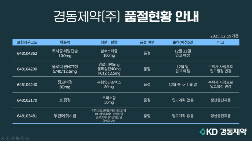 품절미송 12월 19일ㅣ품절 및 입고 일정 안내 작성자관리자 등록일 25-12-22 조회25회 업로드 일시 2025-12-19 품절 & 입고 경동제약, 비보존제약, 아주약품, 한국파비스제약, 마더스제약 본문 12월 22일ㅣ품절 및 입고 일정 안내 12월 16일ㅣ품절 및 입고 일정 안내 목록