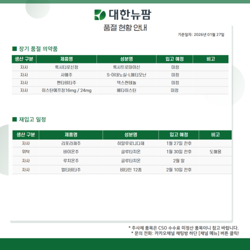품절미송 01월 27일ㅣ품절 및 입고 일정 안내 작성자관리자 등록일 26-01-27 조회2회 업로드일시 2026-01-27 품절 & 입고 대우제약,대한뉴팜,삼성제약,서울제약,셀트리온,안국뉴팜,에이프로젠,유니메드,일화제약,테라젠이텍스,팜젠사이언스 본문 01월 26일ㅣ품절 및 입고 일정 안내 목록