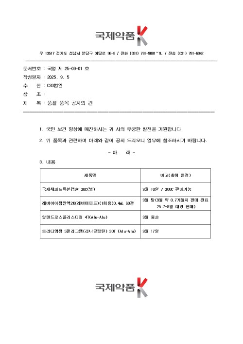 품절미송 ※ 품절 및 입고 일정 안내 작성자관리자 등록일 25-09-05 조회23회 업로드 날짜 2025-09-05 품절 & 입고 국제약품, 위더스제약, 대한뉴팜, 안국뉴팜, 아주약품, 건일바이오팜, 경보제약, 동구바이오, 마더스제약 본문 ※ 품절 및 입고 일정 안내 ※ 품절 및 입고 일정 안내 목록