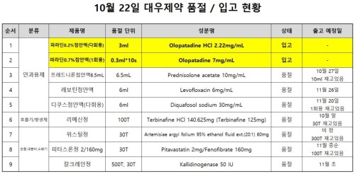 품절미송 ※ 품절 및 입고 일정 안내 작성자관리자 등록일 25-10-22 조회36회 업로드 날짜 2025-10-22 품절 & 입고 대우제약, 이든파마, 동국제약 품절 해제 동구바이오 본문 10월 24일ㅣ품절 및 입고 일정 안내 ※ 품절 및 입고 일정 안내 목록
