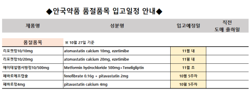 품절미송 10월 27일ㅣ품절 및 입고 일정 안내 작성자관리자 등록일 25-10-27 조회39회 업로드 일시 2025-10-27 품절 & 입고 안국약품, 대우제약, 대한뉴팜, 서울제약, 메디카코리아, 일화제약, 알리코제약, 구주제약, 유니메드제약, 삼성제약, 팜젠사이언스, 고려제약 본문 10월 28일ㅣ품절 및 입고 일정 안내 10월 24일ㅣ품절 및 입고 일정 안내 목록