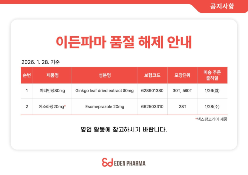 품절미송 01월 28일ㅣ품절 및 입고 일정 안내 작성자관리자 등록일 26-01-28 조회2회 업로드일시 2026-01-28 품절 & 입고 대웅바이오,에이치엘비,이든파마,코오롱제약,한국메딕스 본문 01월 27일ㅣ품절 및 입고 일정 안내 목록