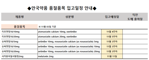 품절미송 11월 03일ㅣ품절 및 입고 일정 안내 작성자관리자 등록일 25-11-03 조회15회 업로드 일시 2025-11-03 품절 & 입고 안국약품, 대한뉴팜, 일화제약, 대우제약, 서울제약, 휴비스트제약, 구주제약, 마더스제약, 유유제약, 팜젠사이언스 본문 11월 04일ㅣ품절 및 입고 일정 안내 10월 31일ㅣ품절 및 입고 일정 안내 목록