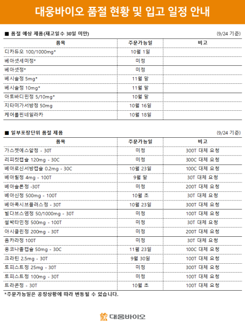 품절미송 ※ 품절 및 입고 일정 안내 작성자관리자 등록일 25-09-24 조회7회 업로드 날짜 2025-09-24 품절 & 입고 대웅바이오, 이든파마, 테라젠이텍 본문 ※ 품절 및 입고 일정 안내 ※ 품절 및 입고 일정 안내 목록