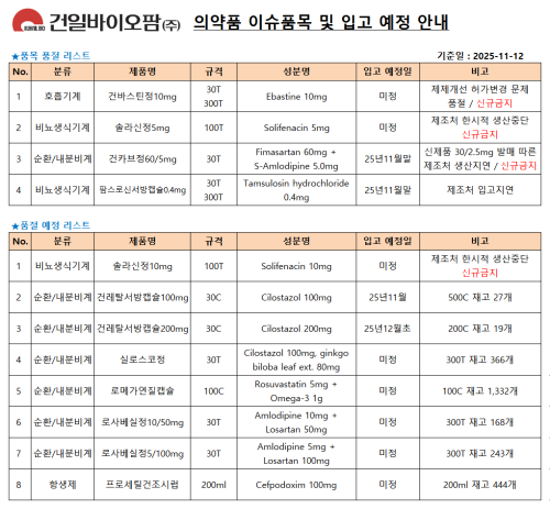 품절미송 11월 12일ㅣ품절 및 입고 일정 안내 작성자관리자 등록일 25-11-12 조회23회 업로드 일시 2025-11-12 품절 & 입고 건일바이오팜, 삼성제약, 알리코제약 본문 11월 13일ㅣ품절 및 입고 일정 안내 11월 11일ㅣ품절 및 입고 일정 안내 목록
