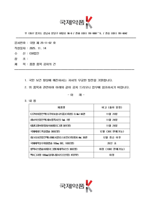 품절미송 11월 14일ㅣ품절 및 입고 일정 안내 작성자관리자 등록일 25-11-14 조회24회 업로드 일시 2025-11-14 품절 & 입고 국제약품, 동구바이오, 아주약품, 마더스제약, 에이프로젠, 제뉴원사이언스 품절 해제 위더스제약 본문 11월 17일ㅣ품절 및 입고 일정 안내 11월 13일ㅣ품절 및 입고 일정 안내 목록