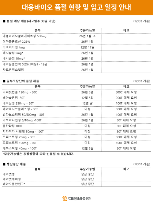 품절미송 12월 03일ㅣ품절 및 입고 일정 안내 작성자관리자 등록일 25-12-03 조회6회 업로드 일시 2025-12-03 품절 & 입고 대웅바이오, 대원바이오텍 품절 해제 이든파마 본문 12월 04일ㅣ품절 및 입고 일정 안내 12월 02일ㅣ품절 및 입고 일정 안내 목록