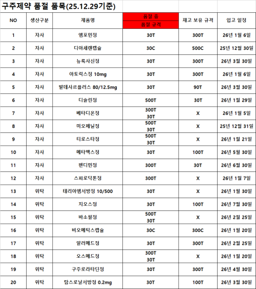 품절미송 12월 29일ㅣ품절 및 입고 일정 안내 작성자관리자 등록일 25-12-29 조회21회 업로드 일시 2025-12-29 품절 & 입고 구주제약,한국메딕스 본문 12월 30일ㅣ품절 및 입고 일정 안내 12월 26일ㅣ품절 및 입고 일정 안내 목록