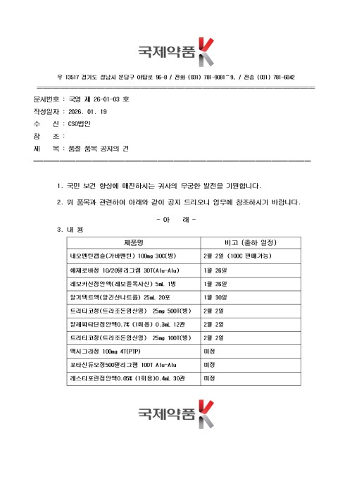품절미송 01월 19일ㅣ품절 및 입고 일정 안내 작성자관리자 등록일 26-01-19 조회13회 업로드 일시 2026-01-19 품절 & 입고 국제약품, 대우제약, 지엘파마, 이든파마, 씨엠지제약, 유유제약, 알리코제약 본문 01월 21일ㅣ품절 및 입고 일정 안내 01월 16일ㅣ품절 및 입고 일정 안내 목록
