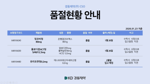 품절미송 01월 23일ㅣ품절 및 입고 일정 안내 작성자관리자 등록일 26-01-23 조회4회 업로드일시 2026-01-23 품절 & 입고 경동제약,국제약품,대우제약,마더스제약,안국약품,영일제약,제뉴원 본문 01월 26일ㅣ품절 및 입고 일정 안내 01월 22일ㅣ품절 및 입고 일정 안내 목록