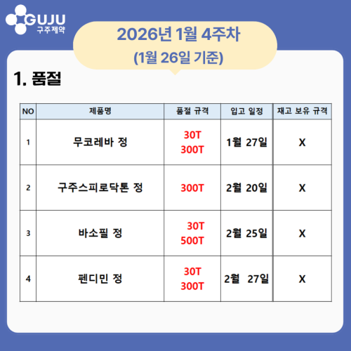 품절미송 01월 26일ㅣ품절 및 입고 일정 안내 작성자관리자 등록일 26-01-26 조회1회 업로드일시 2026-01-26 품절 & 입고 구주제약,에이치엘비,유유제약,이든파마 본문 01월 23일ㅣ품절 및 입고 일정 안내 목록