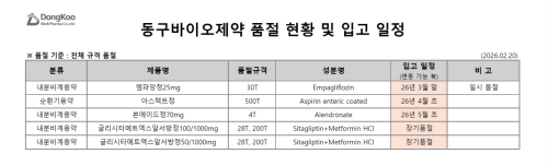 품절미송 02월 24일ㅣ품절 및 입고 일정 안내 작성자관리자 등록일 26-02-24 조회30회 업로드일 2026-02-24 품절 및 입고 재입고 : 대한뉴팜,동구바이오,이든파마,일화제약 /품절 : 건일바이오팜,구주제약,동구바이오,대우제약,대한뉴팜,영일제약,유유제약,이든파마,지엘파마,팜젠사이언스 본문 02월 26일ㅣ품절 및 입고 일정 안내 02월 20일ㅣ품절 및 입고 일정 안내 목록