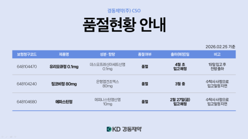 품절미송 02월 26일ㅣ품절 및 입고 일정 안내 작성자관리자 등록일 26-02-26 조회28회 업로드일시 26-02-26 품절 및 입고 경동제약,고려제약,킵스바이오,한국휴텍스,삼성제약,에이치엘비,이든파마,옵투스제약,대한뉴팜 본문 03월 03일ㅣ품절 및 입고 일정 안내 02월 24일ㅣ품절 및 입고 일정 안내 목록