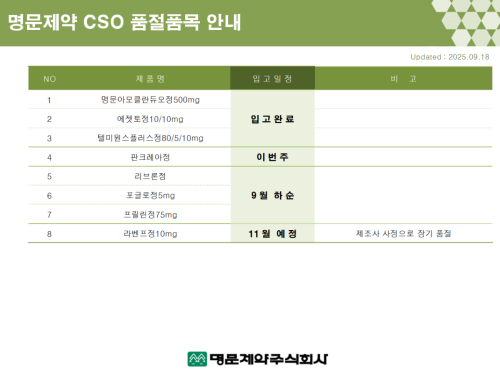 품절미송 ※ 품절 및 입고 일정 안내 작성자관리자 등록일 25-09-19 조회22회 업로드 날짜 2025-09-19 품절 & 입고 명문제약, 대한뉴팜, 위더스제약, 국제약품, 동구바이오제약, 아주약품 본문 ※ 품절 및 입고 일정 안내 ※ 품절 및 입고 일정 안내 목록
