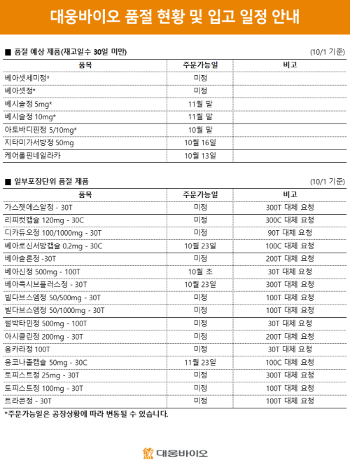 품절미송 ※ 품절 및 입고 일정 안내 작성자관리자 등록일 25-10-01 조회4회 업로드 날짜 2025-10-01 품절 & 입고 대웅바이오 본문 ※ 품절 및 입고 일정 안내 ※ 품절 및 입고 일정 안내 목록