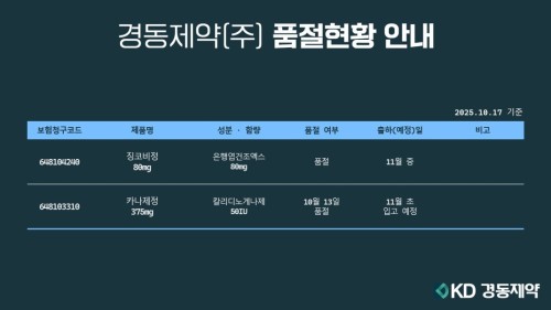 품절미송 ※ 품절 및 입고 일정 안내 작성자관리자 등록일 25-10-17 조회1회 업로드 날짜 2025-10-17 품절 & 입고 경동제약, 국제약품, 대한뉴팜, 메디카코리아, 위더스제약, 아주약품, 제뉴원사이언스 품절 해제 아주약품 본문 ※ 품절 및 입고 일정 안내 목록